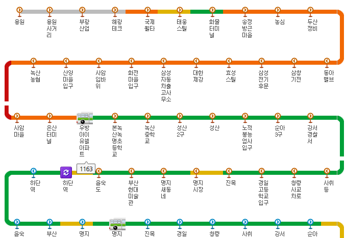 이렇게 순서대로 버스 종류와 노선을 선택하게 되면 아래와 같이 실시간으로 버스가 어느 정류장에 위치하고 있는지 확인 할수가 있습니다.