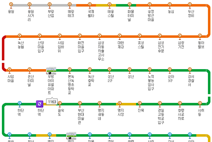 이렇게 순서대로 버스 종류와 노선을 선택하게 되면 아래와 같이 실시간으로 버스가 어느 정류장에 위치하고 있는지 확인 할수가 있습니다.