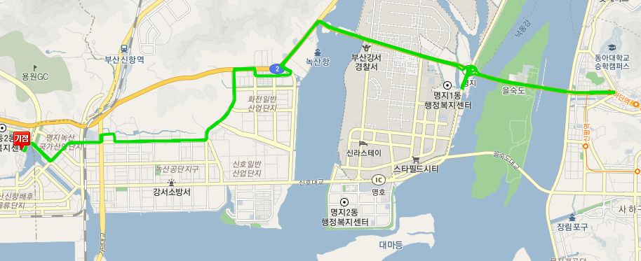위의 경우는 이동하는 지역으로 찾아야 할때 사용시 유용한 출발 도착지 검색입니다. 부산 강서구 마을버스 9-1번 노선만을 이용하기 보다는 환승을 하거나 하는 경우 좀 더 도움이 됩니다. 임의의 장소를 출발 도착지로 놓고 검색해보면 소요시간과 환승 정보등이 자세하게 나옵니다. 원하는 교통수단을 선택하고 소요시간 등의 결과를 보시면 됩니다.