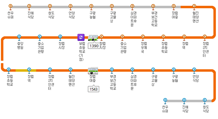 이렇게 순서대로 버스 종류와 노선을 선택하게 되면 아래와 같이 실시간으로 버스가 어느 정류장에 위치하고 있는지 확인 할수가 있습니다.