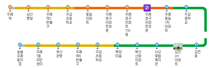 이렇게 순서대로 버스 종류와 노선을 선택하게 되면 아래와 같이 실시간으로 버스가 어느 정류장에 위치하고 있는지 확인 할수가 있습니다.