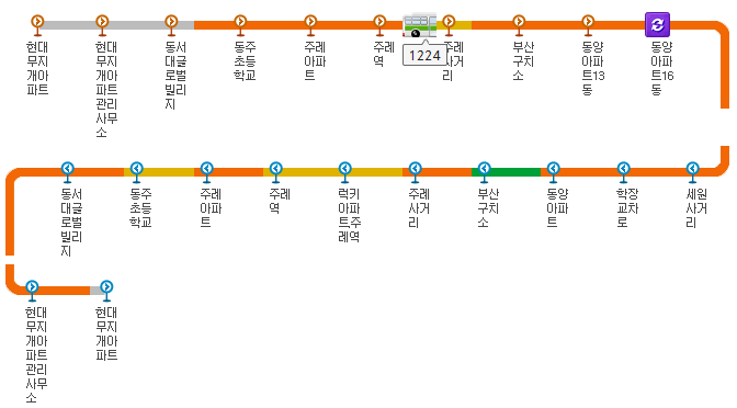이렇게 순서대로 버스 종류와 노선을 선택하게 되면 아래와 같이 실시간으로 버스가 어느 정류장에 위치하고 있는지 확인 할수가 있습니다.