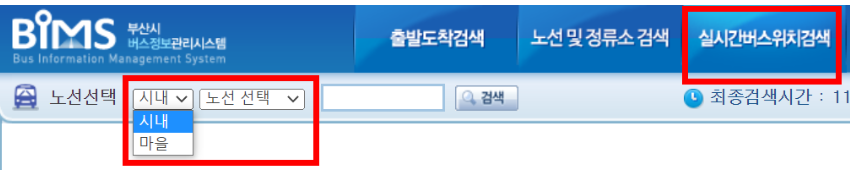 마지막으로 세번째는 실시간 버스위치 검색인데 버스종륭와 번호를 선택하시면 실시간으로 현재 어느 정류장에 버스가 위치해 있는지 체크가 가능합니다. 아래처럼 표시된 부분을 간단하게 클릭만 하시면 됩니다.
