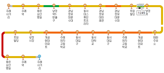 이렇게 순서대로 버스 종류와 노선을 선택하게 되면 아래와 같이 실시간으로 버스가 어느 정류장에 위치하고 있는지 확인 할수가 있습니다.