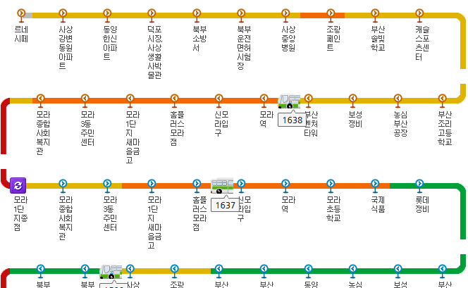 이렇게 순서대로 버스 종류와 노선을 선택하게 되면 아래와 같이 실시간으로 버스가 어느 정류장에 위치하고 있는지 확인 할수가 있습니다.