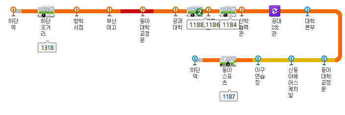 이렇게 순서대로 버스 종류와 노선을 선택하게 되면 아래와 같이 실시간으로 버스가 어느 정류장에 위치하고 있는지 확인 할수가 있습니다.