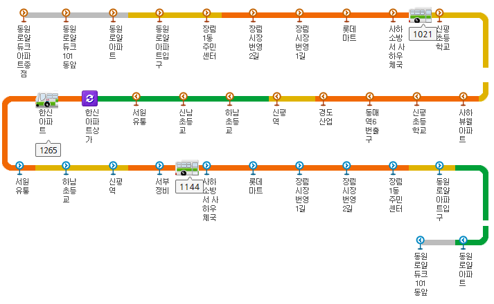 이렇게 순서대로 버스 종류와 노선을 선택하게 되면 아래와 같이 실시간으로 버스가 어느 정류장에 위치하고 있는지 확인 할수가 있습니다.
