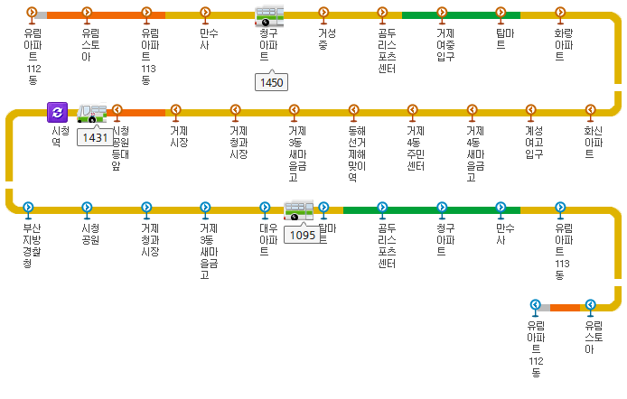 이렇게 순서대로 버스 종류와 노선을 선택하게 되면 아래와 같이 실시간으로 버스가 어느 정류장에 위치하고 있는지 확인 할수가 있습니다.