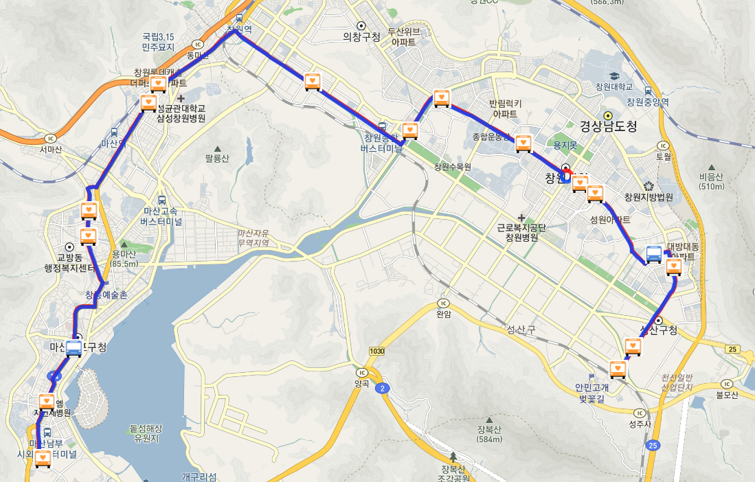아래처럼 지도상에 창원 103번 버스 노선 및 현재 실시간 버스 위치 등을 보실수 있고 방면별 구분이 되어 있어서 확인이 편합니다.