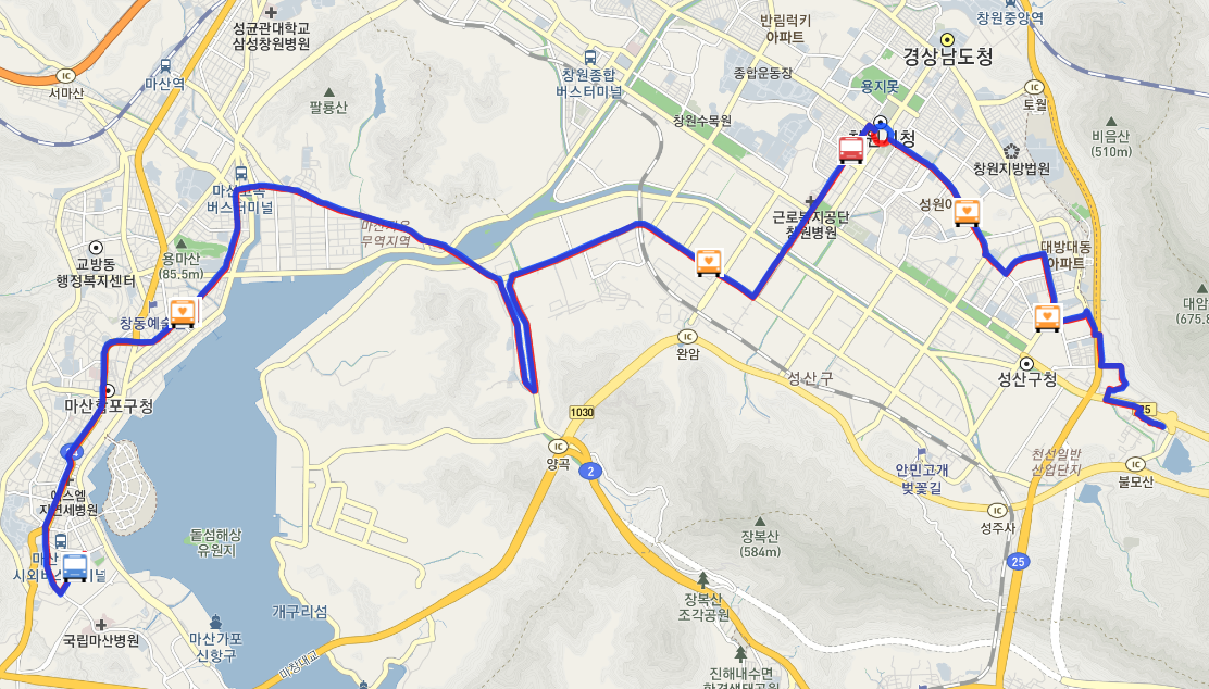 아래처럼 지도상에 창원 107번 버스 노선 및 현재 실시간 버스 위치 등을 보실수 있고 방면별 구분이 되어 있어서 확인이 편합니다.