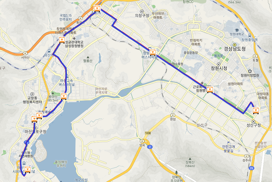 아래처럼 지도상에 창원 108번 버스 노선 및 현재 실시간 버스 위치 등을 보실수 있고 방면별 구분이 되어 있어서 확인이 편합니다.