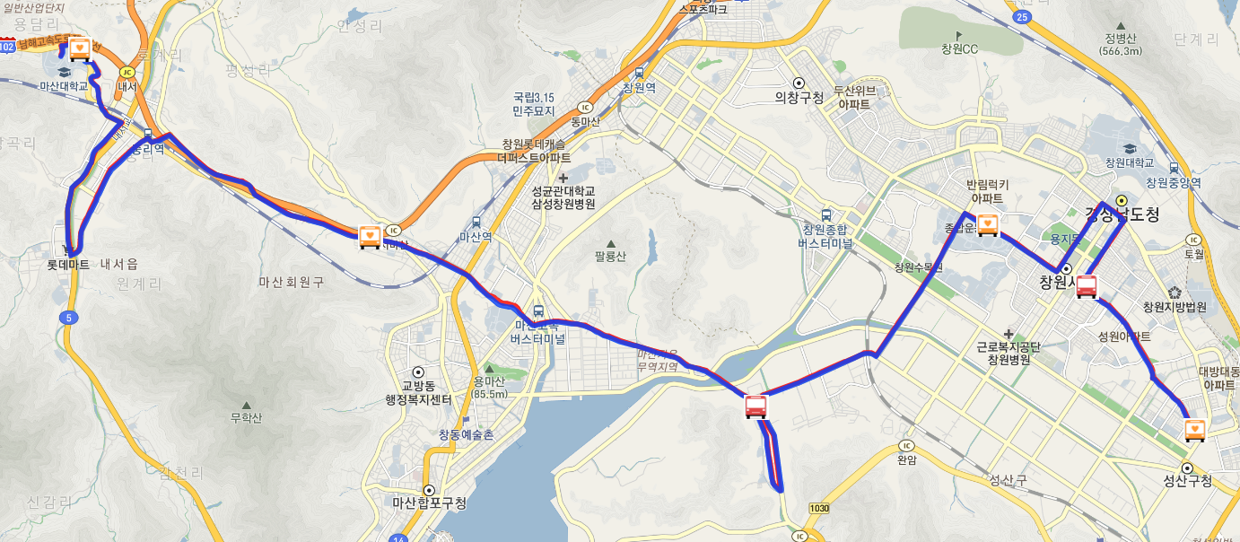 아래처럼 지도상에 창원 116번 버스 노선 및 현재 실시간 버스 위치 등을 보실수 있고 방면별 구분이 되어 있어서 확인이 편합니다.