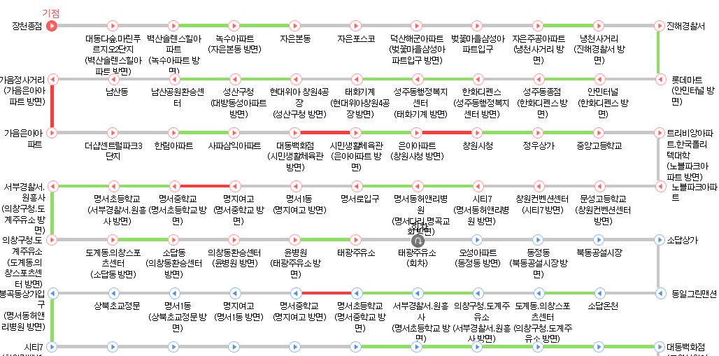 아래처럼 지도상에 창원 155번 버스 노선 및 현재 실시간 버스 위치 등을 보실수 있고 방면별 구분이 되어 있어서 확인이 편합니다.