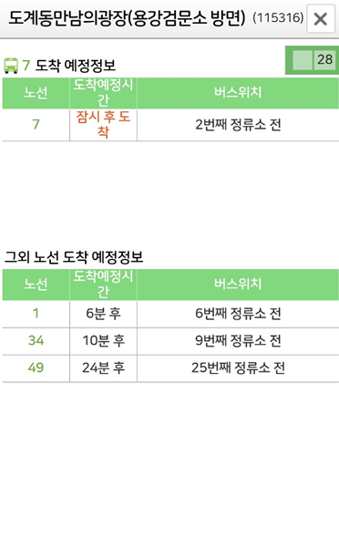 해당하는 정류장을 통과하는 노선과 도착예정 정보를 확인할 수 있어서 매우 편리합니다. 특히나 정류소는 방면별로 따로 체크가 가능하니 이동하는 방면을 안다면 매우 유용한 정보가 될것 같습니다.