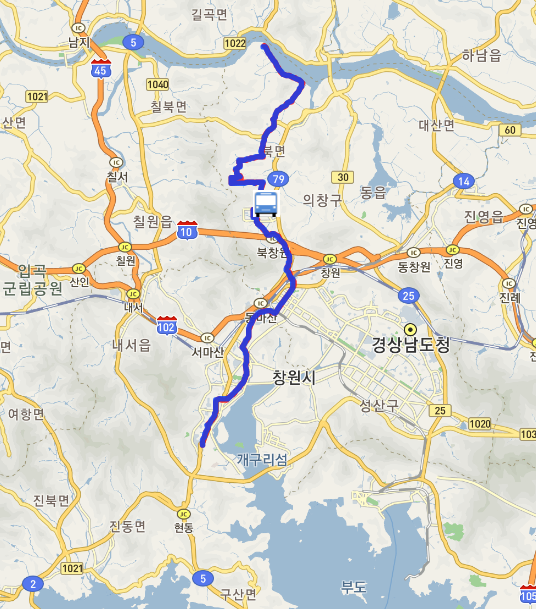 아래처럼 지도상에 창원 22번 버스 노선 및 현재 실시간 버스 위치 등을 보실수 있고 방면별 구분이 되어 있어서 확인이 편합니다.