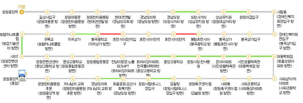 아래처럼 지도상에 창원 221번 버스 노선 및 현재 실시간 버스 위치 등을 보실수 있고 방면별 구분이 되어 있어서 확인이 편합니다.