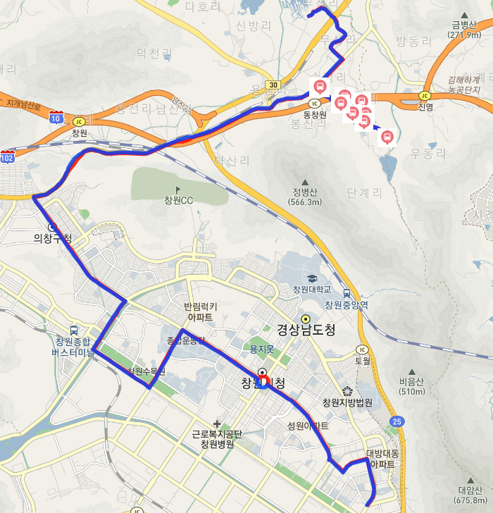 아래처럼 지도상에 창원 34번 버스 노선 및 현재 실시간 버스 위치 등을 보실수 있고 방면별 구분이 되어 있어서 확인이 편합니다.