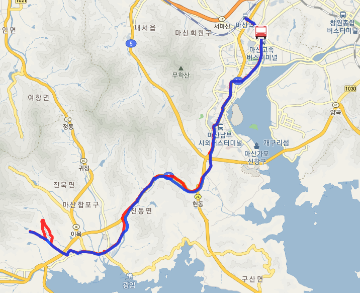 아래처럼 지도상에 창원 74번 버스 노선 및 현재 실시간 버스 위치 등을 보실수 있고 방면별 구분이 되어 있어서 확인이 편합니다.