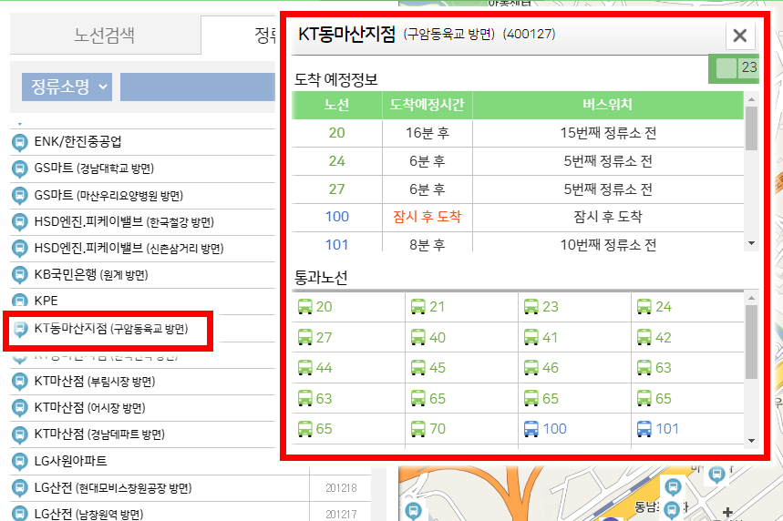 위의 사진처럼 해당하는 노선을 클릭하고 정류장을 선택하면 해당 정류소에서의 예상 도착시간도 확인을 할 수 있습니다.